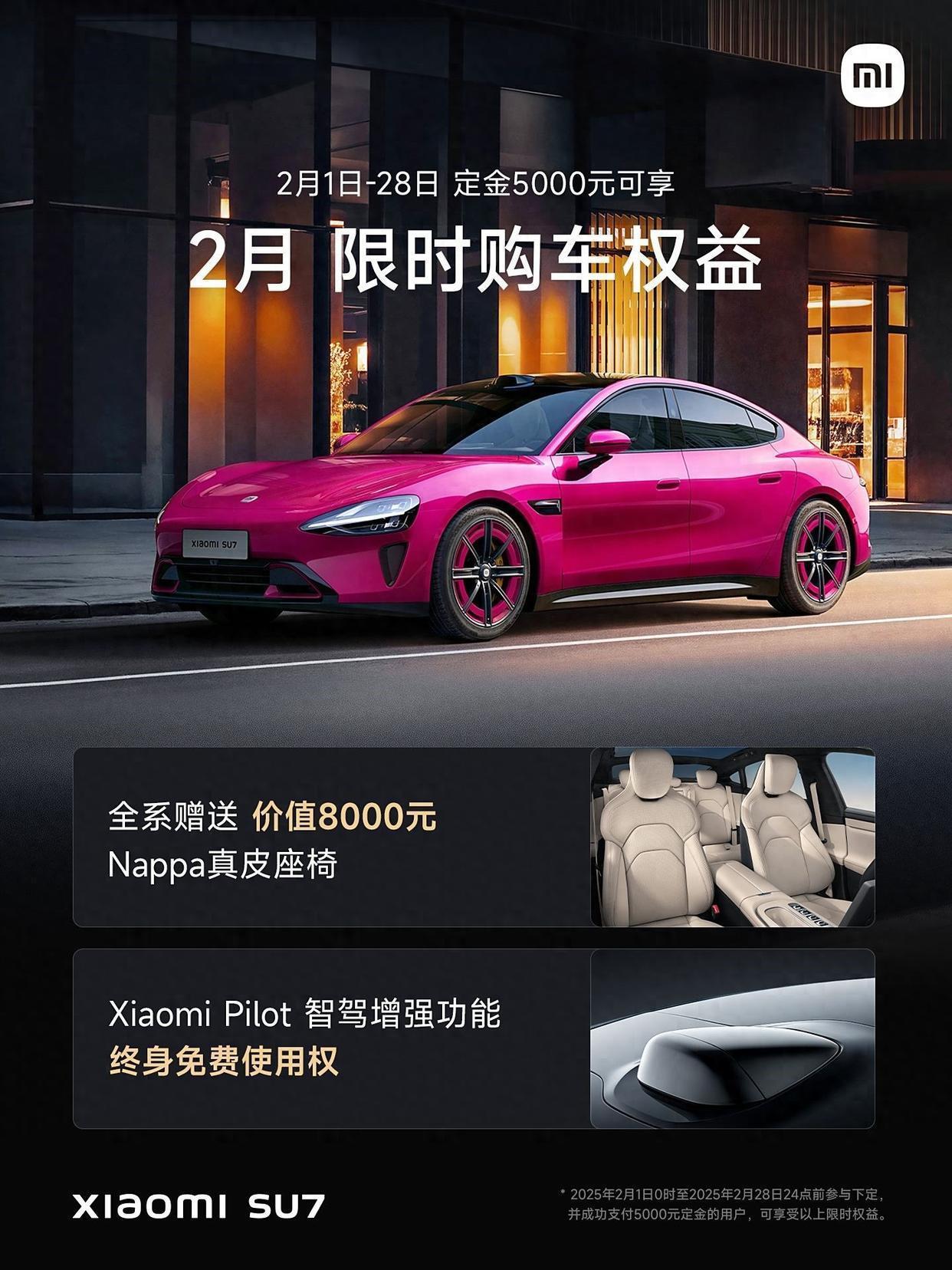 购车权益方面,2月份购车,交5000元定金,赠送8000元的Nappa真皮座椅、Xiaomi Pilot智驾增强功能终身免费使用。